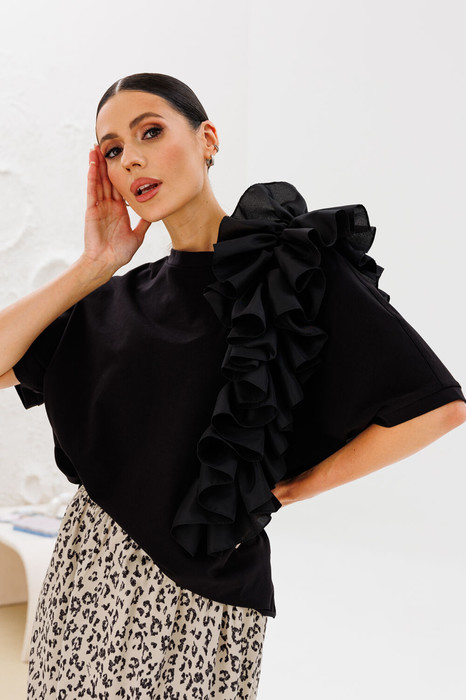 Блузон прямого свободного силуэта (в стиле оверсайз) со спущенной линией плеча. Горловина выкроена в стиле «лодочка», обработана планкой-бейкой шириной 2,5 см, такой же планкой обработан край спущенного рукава. Длина спущенной плечевой линии 35 см. На детали полочки (длина рюши 50 см) и спинки (длина рюши 27 см) расположена декоративная деталь вертикальная ассиметричная рюша на сборке по центру, шириной 22 см из отделочной ткани.