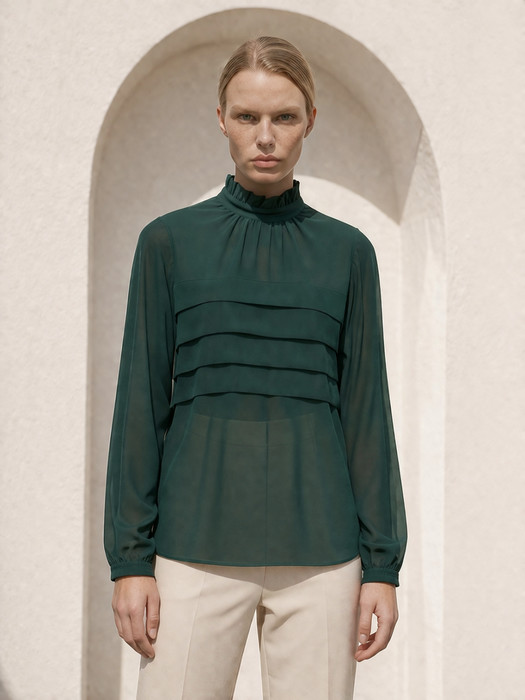 Блузка с воротником стойкой. Перед со складками на уровне груди и сборкой от горловины. Спинка с застёжкой на петлю и пуговицу от горловины. Рукава втачные с манжетами и с застёжкой на пуговицу по низу.