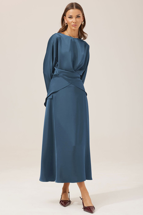 Нарядная блузка прямого силуэта с фигурным низом из струящейся ткани. Горловина округлая на спинке застежка на петлю и пуговицу. Рукав цельнокроеный по низу манжета с застежкой на петлю и пуговицу. В комплект входит съемный пояс из основной ткани для регулирования степени прилегания.