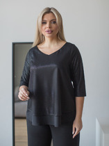 Стильная блуза прямого силуэта с акцентными рукавами. Горловина округлая, на спинке застежка на потайную молнию. По горловине сборка и декоративные складки. Рукав покроя реглан длинный и широкий, по низу собран на эластичную тесьму (резинку).