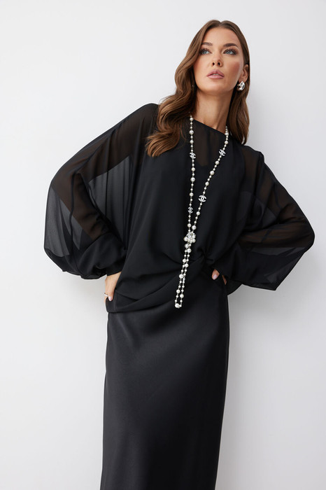 Блуза из шифона. Свободного, расширенного силуэта, с широким цельнокроеным рукавом со сборкой по нижнему срезу. Рукав с манжетой, манжета с застежкой на петлю с пуговицей.  Горловина овальной формы. Застежка по среднему шву спинки на петлю с пуговицей. Нижняя блуза из  струящейся ткани.  Силуэт прямой, свободный. С глубоким V- образным вырезом горловины по переду. С нагрудными вытачками.