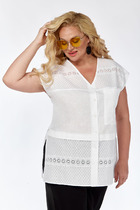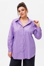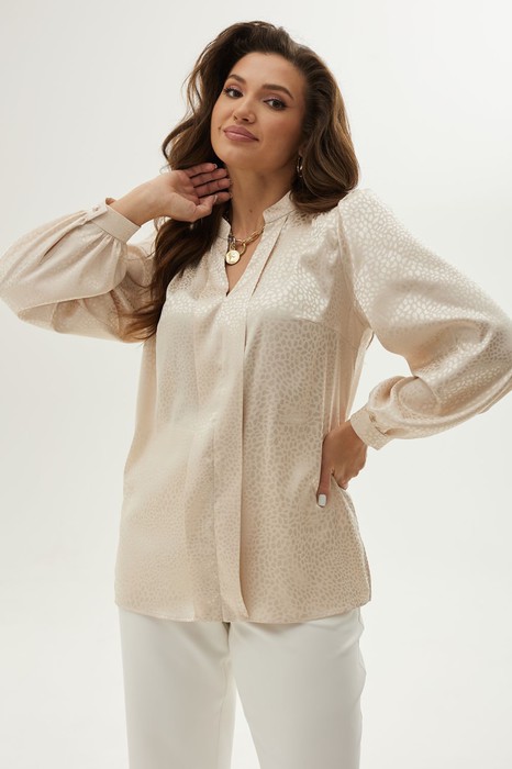 Блуза женская прямого силуэта. По переду притачные отлетные декоративные планки. V-образный вырез горловины. Воротник-стойка. Слегка укороченная линия плеча. По окату рукава сборка. С изнанки шва притачивания рукава - подокатник для усиления эффекта сборки оката. По низу рукава также сборка. Рукав застегивается на манжет с одной пуговицей. По боковым швам разрезы.