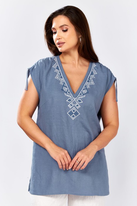 Блуза прямого силуэта.В боковых швах разрезы.Спинка со средним швом. По переду нагрудные вытачки . Горловина с V - образным вырезом , украшена декоративной вышивкой. По плечевому шву обработана кулиса с завязками из основной ткани.