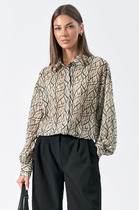 Блуза полуприлегающего силуэта. В боковых швах разрезы . Низ разноуровневый. По переду нагрудные вытачки и декоративная вышивка. Рукав втачной, расширен к низу. В нижней части декоративный элемент с кулисой, завязки выполнены из основной ткани . Горловина "лодочка".