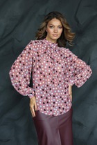 Нарядная блузка из атласной ткани. На полочке складки, небольшой V-образный вырез и декоративная стойка. Спинка со средним швом и застежкой на молнию. В боковых швах по низу разрезы