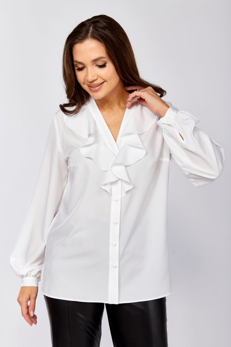 Нарядная блузка из струящейся ткани с застежкой на планку и пуговицы. На полочке по горловине волан, входящтй в планку.Рукав расширенный к низу со складками на манжете. Вырез V-обраный.  В боковых швах по низу разрезы