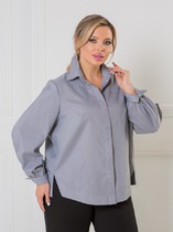 Блузка женская, свободного кроя со спущенной линией плеча. Спинка цельная c вырезом “капелька” на застежку петля-пуговица. Рукав прямой длиной за локоть. По центру полочки, по низу блузки и по рукаву вставки из отделочной ткани. Низ изделия фигурный.