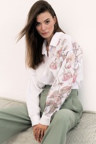 Женская нарядная блузка свободного кроя. По переду фигурная планка с V-образным вырезом застегивающаяся на пуговицу и кокеткой со сборкой. Спинка блузки цельная. Рукав с манжетой на застежку петля-пуговица. Низ изделия фигурный.