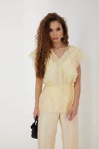 Стильная блузка свободного покроя с V-образным вырезом горловины. Линия плеча спущенная, рукав длинной за локоть. Блузка с накладным карманом слева. Рукава и карман декорированы кружевной лентой. По низу изделия широкая подгибка.