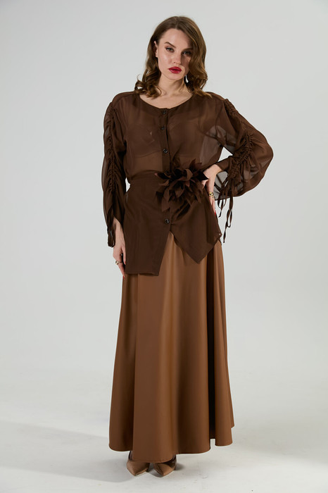 Блуза прямого кроя с центральной застёжкой на петли и пуговицы. Вырез горловины глубокий округлый. Линия плеча приспущена. На рукавах изделия заложена декоративная сборка с регулируемыми завязками (кулиса). В комплект к изделию идёт узкий пояс из основной ткани с авторским украшением ручной работы.