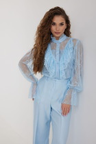 Оригинальная блузка свободного силуэта, выполнена в сочетании трикотажного и хлопкового полотен. Перед блузки целый с двумя нагрудными вытачками. Спинка с отрезной кокеткой и глубокой встречной складкой по шву притачивания кокетки. Блузка с фигурными боковыми швами, переходящими на перед. Горловина переда и спинки с узкой притачной планкой. Блузка со свободной заниженной проймой. Рукав втачной, длиной 3/4, из двух частей. Нижняя часть рукава в форме баллон с узким притачным манжетом по низу. Длина рукава от плеча в 52 р-ре – 45 см. в 64 р-ре – 47 см, ширина рукава по низу в 52 р-ре – 29 см. в 64 р-ре – 32 см. Низ блузки фигурный, разно-уровневый, спинка длиннее переда на 10 см. Блузка без застежек и подклада. Длина изделия по спинке в 52 р-ре – 78 см. в 64 р-ре – 85 см.