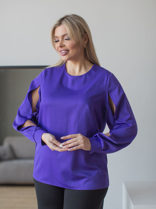 Элегантная блузка прямого силуэта, выполнена из шелковистой эластичной плательной ткани. Перед и спинка блузки целые, по переду две нагрудные вытачки. Круглый вырез горловины переда и горловина спинки обработаны обтачками. По горловине спинки небольшой щелевидный разрез с застежкой на воздушную петлю и пуговицу. Особую элегантность блузке придает втачной длинный рукав с притачным манжетом по низу. Вертикальный разрез по всей длине передней части рукава и сборка по шву притачивания манжеты делают рукав свободным и удобным в носке. Манжеты с застежкой на петли и пуговицы. Длина рукава от плеча в 46 р-ре – 60 см. в 62 р-ре – 63 см., ширина рукава по низу в 46 р-ре 20 см. в 62 р-ре – 24 см. Блузка без подклада. Длина изделия по спинке в 46 р-ре – 63 см. в 62 р-ре – 72 см.