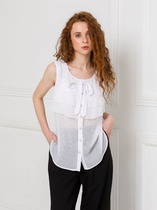 Модель прямого силуэта, без рукавов. Спинка с кокеткой, под кокеткой складка. Низ блузы закруглен. В боковых швах разрезы. Горловина, пройма и низ изделия окантованы.