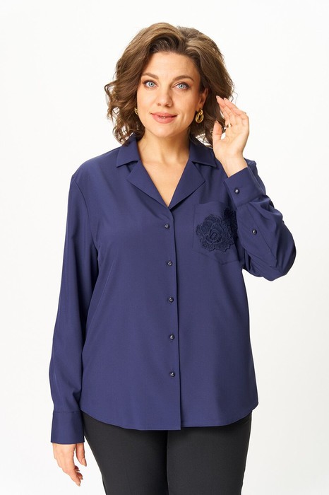 Блузка женская из хлопковой ткани, прямого силуэта с втачным рукавом. Линия плеча слегка спущена. Застежка центральная на петли и пуговицы. Воротник отложной с лацканами. Перед с вытачками по линии груди. По левой части переда накладной карман с отделкой. Рукав длинный рубашечный, по низу притачная манжета с застежкой петли и пуговицы. Линия низа фигурная.