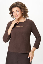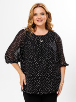 Блузка женская из поливискозной эластичной ткани. Перед цельнокроеный с нагрудными выточками и продольной бантовой складкой по центру. Ширина складки 5 см. Спинка разрезная из двух частей. В среднем шве спинки по горловине обработан разрез с застёжкой на навесную петлю и потайную пуговицу. Рукав втачной одношовный. Низ рукава обработан манжетой с застёжкой на пробивную петлю и декоративную пуговицу. Ширина манжеты 2,5 см.