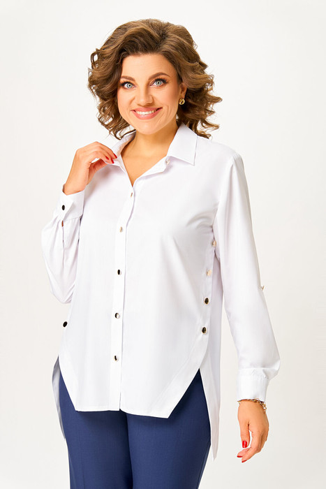 Рубашка женская прямого силуэта с центральной застёжкой на петли и декоративные пуговицы, выполнена из хлопчатобумажной ткани. Боковые швы полочки и спинки имеют фигурную форму и соединяются между собой застёжкой на петли и декоративные пуговицы. Воротник рубашечный, отложной на стойке. Рукав втачной, одношовный, длинный с манжетой, которая застёгивается на петлю и пуговицу, и патой, которой регулируется длина рукава. Низ рубашки разноуровневый, полочка короче, спинка -длиннее.