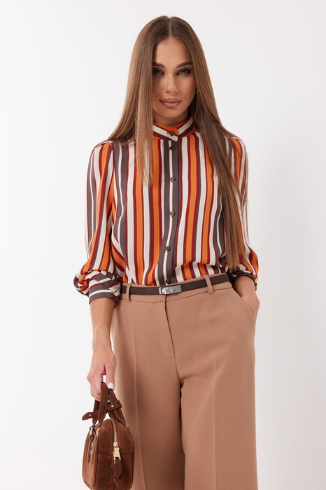 Блузка прямого силуэта. Застёжка по переду на петли и пуговицы. Воротник стойка. Рукав со складками сверху и сборкой по низу, на манжете. Манжета с застёжкой на петли и пуговицы.