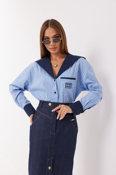 Блузка прямого силуэта. Застёжка по переду на петли и пуговицы. Воротник отложной фигурной формы. На переде накладной карман с вышивкой. Рукав прямой с манжетой. Манжета с застёжкой на петли и пуговицы. Низ блузки фигурной формы.