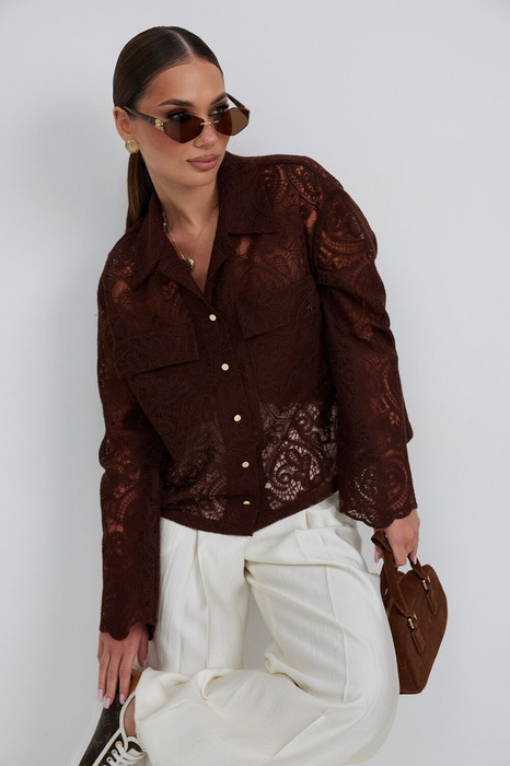Блузка из кружевной ткани свободного силуэта. По переду центральная застежка на петли и пуговицы, сверху накладные карманы с клапанами. Втачной рукав слегка расширен к низу. Воротник рубашечный.