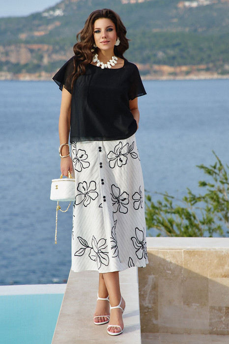 Блуза женская  из полупрозрачной чёрной ткани, которая струится по телу, сквозь которую мерцают контуры силуэта. Ткань мягкая, воздушная, почти невесомая, но при этом обладает благородной структурой, которая держит форму. Блуза свободного силуэта, с фигурной формой горловины. Рукава в блузе короткий, на основе реглана. Деталь переда двойная, с нагрудными вытачками. Спинка в блузе с отрезной кокеткой. От подреза деталь спинки выполнена из отделочной ткани в принт-полоску. Отделочная ткань более плотная, с выраженной текстурой. Полоски не просто нарисованы — они тканые, что чувствуется пальцами: можно провести по ним и ощутить рельеф. Низ в блузе фигурный. Длина блузы 56 см (р 52-56), 57 см (р 56-60)