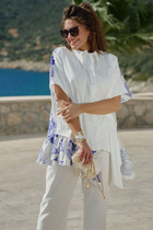 Блузка женская в светлом молочном оттенке с яркими акцентными принтоваными деталями. Она для тех, кто ценит тихий диалог между тканью и телом. Она напоминает, что лето — это не только яркие краски и кричащие принты. Отличный вариант на лето, который также можно стилизовать делая образ ещё более ярким. Невероятно красивый яркий принт в гармоничном сочетании с белым оттенком в данной модели перенесёт Вас на юг Италии и создаст образ, который будет приковывать внимание.