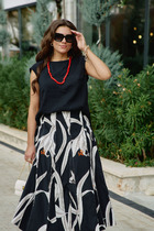 Блузка свободного силуэта, материал струится по телу лёгкой прохладой, горловина — изящный полукруг, обрамляющий ключицы. По переду нагрудные вытачки, линия плеча слегка спущенная. Низ в блузке фигурной формы, в боковых швах небольшие разрезы. Длина блузки по спинке 63,5 см, длина рукава (плеча) 12 см (р 50-54), 12,5 см (р 56-60). Длина юбки 87 см (р 50-54), 88 см (56-60).