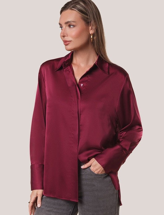Состав: 94%ПЭ 6%ПУ Плотность: 107 Г/м2 Параметры модели на первом фото: Рост 170, бюст 89, талия 63, бедра 92 Размер товара на первом фото: 42Сатиновая блузка с эластаном винного цвета – воплощение элегантности и комфорта. Благородный блеск сатина добавляет образу шика, а эластичность материала гарантирует удобство при носке. Прямой силуэт блузки обеспечивает комфорт, а эластичность материала предотвращает деформацию. Застежка-планка с потайными пуговицами придает модели аккуратность. Универсальный вариант для casual-образов.