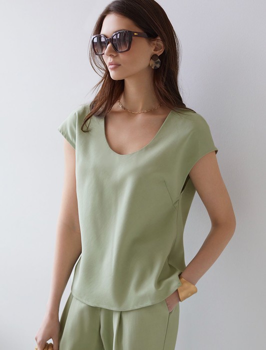 Состав: 76%Лиоцелл (Вис) 24%ПЭЭлегантная блузка светло-зеленого цвета скроенная по косой выполнена из плотного лиоцелла. Лиоцелл это более дорогой и экологичный вариант вискозы, очень прочный и шелковистый. Эта повседневная блузка с трендовым U-вырезом создана для легкого и утонченного стиля. Мягкие линии кроя создают невероятно эффектный образ, который подчеркивает естественную красоту, не стесняя движений, а свободный фасон дарит ощущение абсолютного комфорта и уверенности. Блузка красиво драпируется при движении, создавая летящий, воздушный эффект. Эта легкая блуза с коротким рукавом идеальный выбор для комфорта и стиля в теплое время года, она будет идеальна для любого повода.