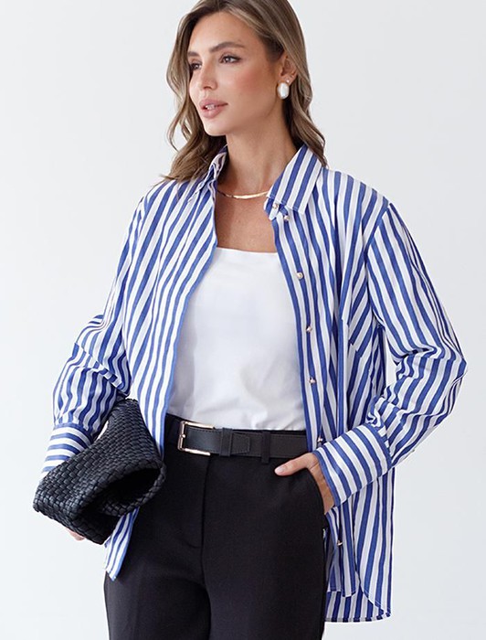 Состав: 65%Хлопок 35%ПЭ Плотность: 100 Г/м2 Параметры модели на первом фото: Рост 170, бюст 89, талия 63, бедра 92Блузка свободного силуэта выполнена из смесовой струящейся ткани. Модель в вертикальную полоску дополнена золотистыми рельефными пуговицами. Свободный силуэт подходит для любой фигуры. Для идеального роскошного образа используйте в качестве низа брюки светлых тонов. На спинке изделия фирменный металлический логотип бренда.