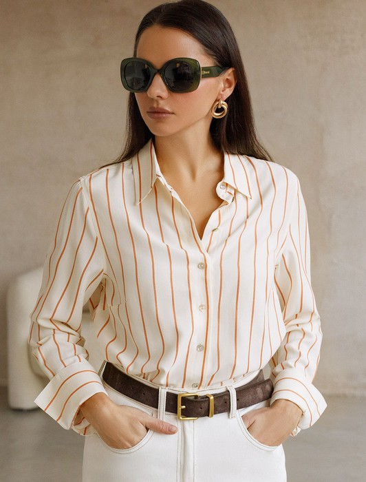 Состав: 75%Хлопок 25%ПЭ Плотность: 108 Г/м2Блузка свободного силуэта молочного цвета в коралловую полоску из хлопка идеально подходит для теплого сезона и порадует всех, кто ценит комфорт и стиль. Натуральный материал плотностью 108 Г/м2 обеспечивает приятное ощущение на теле и хорошо пропускает воздух, что особенно важно летом и весной. Блузка с длинным рукавом обладает высокой износостойкостью, что позволяет сохранять привлекательный внешний вид даже при регулярном использовании. Ткань хорошо держит форму после стирки и надолго остается аккуратной. Эластан в составе обеспечивает отличную посадку на любую фигуру. Классическая рубашка с отложным воротником и широкими манжетами формирует актуальный образ, подходящий как для работы, так и для повседневных прогулок. Пуговицы на планке добавляют практичности и позволяют регулировать степень открытости, что также способствует созданию различных вариантов ношения, например, в качестве второго слоя. Прямой свободный крой рубашки не сковывает движения и создает ощущение легкости, а принт в полоску делает образ выраженным, современным и подчеркивает индивидуальность. Повседневная блузка гармонично сочетается с любыми низами, что делает ее универсальной частью гардероба.