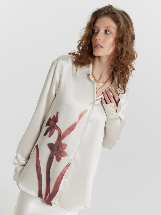 Блузка женская прямого силуэта из сатиновой ткани. Горловина круглой формы, в горловину втачан стояче-отложной воротник. Центральная застежка на пуговицы.