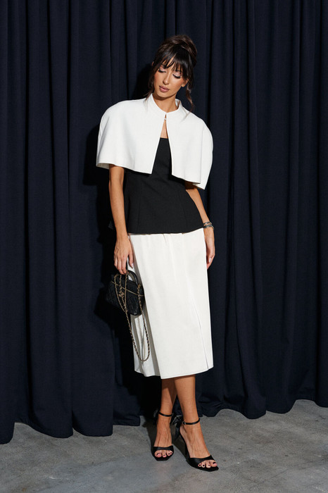 Кейп выполнен из костюмной ткани. Характеристики: горловина стойка, застежка центральная на крючок, подплечники, брендированная подкладка. Длина по спинке 33см.