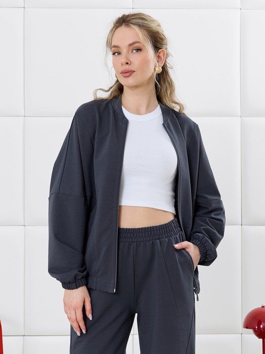 Куртка – бомбер молодежная из гладкокрашенного трикотажного полотна «футер» прямого силуэта, свободная, со спущенной линией плеча, длинными втачными рукавами и накладными карманами. Горловина овальной формы, обработана втачной планкой. Центральная бортовая застежка на тесьму «молния». Полочка состоит из трех деталей, две из которых скроены по косой, с отделочными строчками по шву стачивания. Низ изделия и нижние срезы рукавов обработаны подгибкой с эластичной тесьмой внутри.