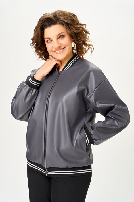 Бомбер женский из мягкой экокожи на подкладке свободного кроя со спущенной линией плеча и с центральной застёжкой на декоративную металлическую молнию. Полочка с отрезными бочками и карманами в швах. Горловина округлая со стойкой из трикотажного довяза. Рукав длинный. По низу рукава и изделия - довяз.
