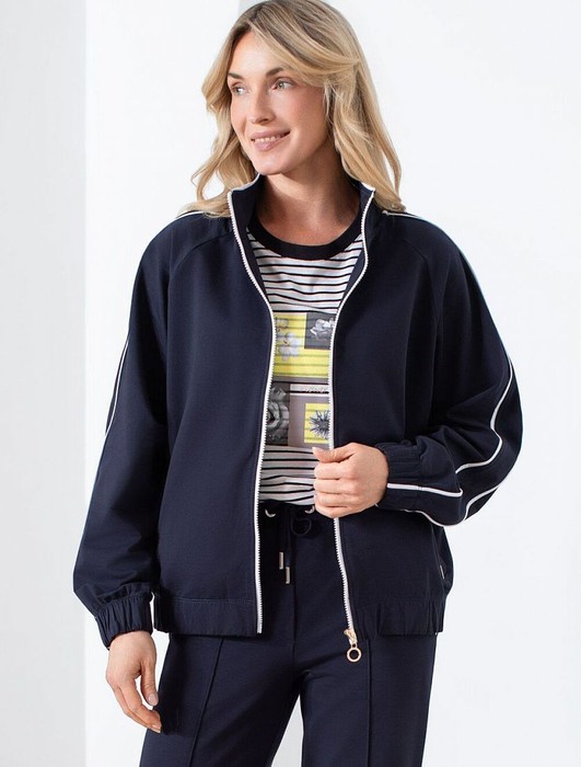 Свободный бомбер темно-синего цвета на молнии выполнен из премиального футера двухнитки плотностью 240 Г/м2. Натуральный состав обеспечивает хорошую воздухопроницаемость, мягкость и приятные тактильные ощущения, Эластичный материал олимпийки позволяет свободно двигаться без лишнего стеснения, а также отлично сохраняет форму даже после длительного ношения. Манжеты на рукавах и резинка по низу обеспечивают надежную посадку, сохраняя тепло в прохладную погоду. Повседневный бомбер отличается универсальной длиной, которая идеально подходит для повседневного и спортивного образа. Контрастные лампасы на рукавах придают образу динамику и визуально вытягивают силуэт, делая модель актуальной. Прорезные карманы по бокам добавляют функциональности, сохраняя при этом стильный внешний вид. Представленная размерная линейка позволяет подобрать оптимальный вариант для любой фигуры и размера, на маленький или плюс сайз, обеспечивая идеальную посадку без компромиссов по стилю. Эта зипка на молнии станет отличным дополнением к