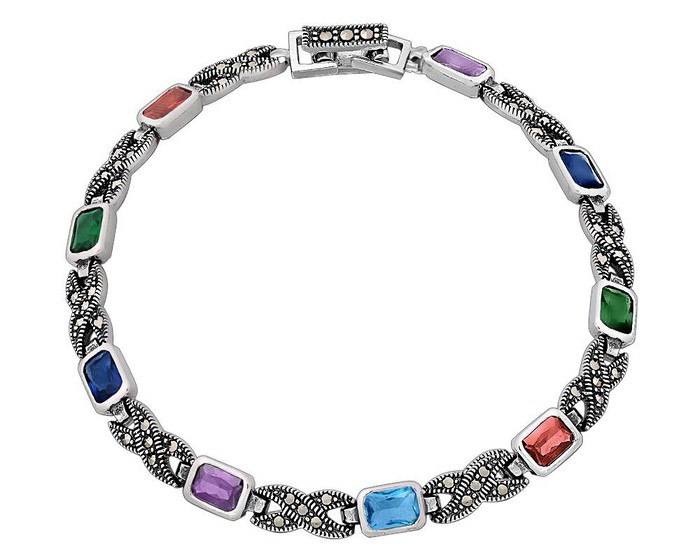 Вес: 11.14 г Вставка: Марказит Цвет камня: Микс Производство: Таиланд Покрытие: Оксидирование Количество: 7Браслет, арт.656336 Серебро Серебро 925, р. 18, 11,14 гр., марказит , синт.аметист , синт.изумруд , синт.рубин
