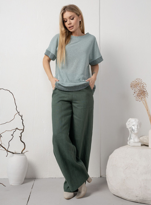 Очень комфотртные и модные льняные  брюки с карманами в боковых швах и  на резинке по талии.