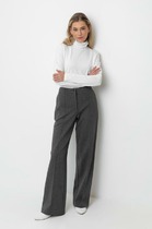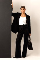 Брюки классические, со стрелками, полной длины, выполнены из однотонной ткани. В области бедер полуприлегающие, в колене и по низу прямые. По передним половинкам обработаны складки по линии талии и наклонные карманы, в среднем шве застежка на молнию. По задним половинкам обработаны талиевые вытачки. Брюки на притачном поясе с эластичной тесьмой и застежкой на петлю и пуговицу.