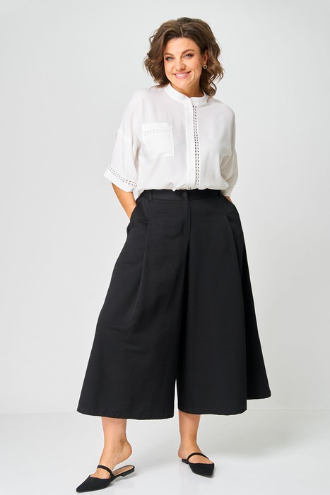 Укороченные брюки кюлоты - идеальный вариант для создания модного образа! Они прекрасно сочетаются как с деловыми жакетами, блузками, так и с повседневными вещами. Изготовленные из вискозы со льном, они приятно прилегают к телу и не сковывают движения. Высокая посадка и широкие штанины придают им оригинальности и создают впечатление изысканности. Пояс частично с резинкой, застёжка на молнию обеспечивают удобство в носке. Не упустите возможность выглядеть стильно и модно с помощью этих брюк кюлотов.
