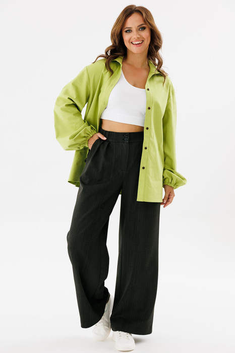 Брюки широкие длинные с высокой посадкой. На передних половинках складки. Пояс притачной с застежкой на молнию, петли и пуговицы, со вставками эластичной тесьмы по бокам. В боковых швах расположены карманы с косым входом.