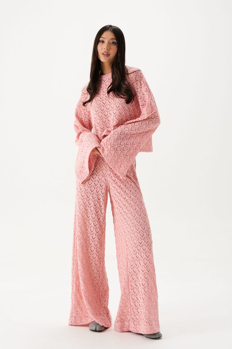 Брюки прямого кроя выполнены из трикотажного полотна узорной вязки розового цвета. Характеристики: прямой крой, пояс на резинке на подгибе. Длина 110 см. Образ дополнит топ, артикул А2021 и А2121.