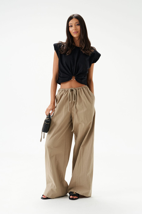 Брюки прямого, свободного кроя. Выполнены из хлопкового полотна цвета "Хаки". Характеристики: прямой крой, пояс на резинке с кулиской, в боковых щвах карманы. Сзади нашито два функциональных кармана. По переду и сздали брюк две прошитые строчки. Длина по боковому шву 107см