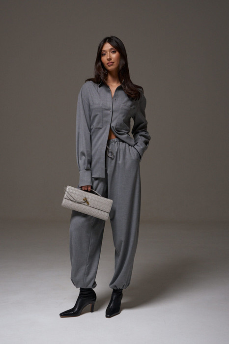 Брюки-джоггеры. Выполнены из мягкого текстильного полотна цвета серый меланж. Характеристики: прямой крой, пояс на резинке, в боковых швах карманы, штанина внизу на резинке с фиксатором. Длина 107 см.