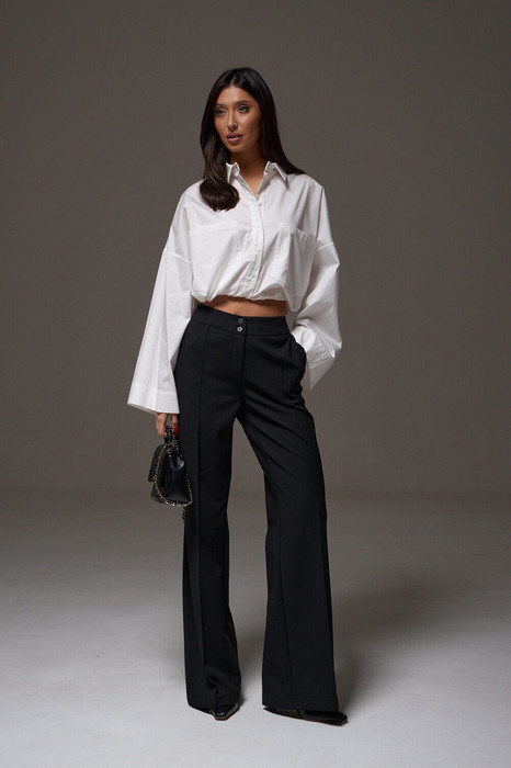 Брюки прямого кроя, выполнены из черной костюмной ткани. Характеристика: прямой крой, пояс стабильный, застежка на петли - пуговицы, молния. В боковых швах карманы. По передней и задней части изделия простроченные стрелки. Длина по боковому шву 111см, длина брюк по внутреннему шву 84см.