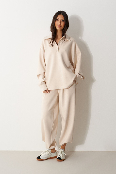 Брюки выполнены из трикотажного полотна молочного цвета. Характеристики: прямой крой, пояс на резинке с кулиской, в боковых швах карманы, накладные карманы на задней части брюк, штанина внизу на резинке с фиксатором. Длина по боковому шву 100 см.