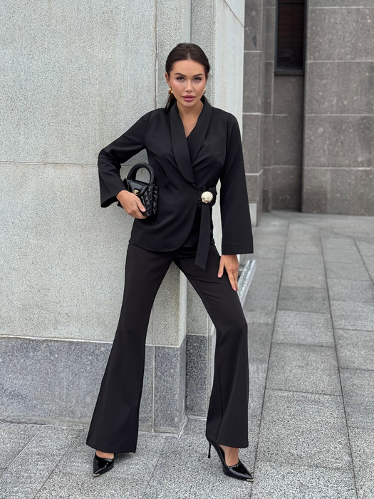 Брюки классические, по форме прямые, клешенные от лиии колена, застежка - потайная молния. Съёмный пояс из основной ткани, обработан пряжкой - в комплекте