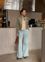 Клаассические брюки палаццо выполнены из плотного джинса в снежно-голубом оттенке. По передним половинкам обработанывтачные карманы. Пояс притачной. Застёгиваются на молниб и пуговицу. Боковые швы брючин по низу дополнены невысоким разрезом