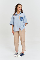 Брюки из 100% хлопковой ткани с легким крэш эффектом, свободного силуэта, зауженные к низу. В изделии шесть функциональных карманов, декорированных хлястиками с пуговицами. Пояс на резинке, с декоративным хлопковым шнуром. Ширина брюк внизу регулируется с помощью хлястика.