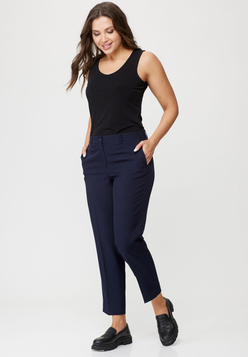 Брюки классические, из плотной текстильной ткани, прямые, слегка заужены к низу, заутюжены стрелки, по переду обработаны карманы с отрезным бочком, застежка на тесьму-молнию и 1 пуговицу. На задних половинках обработаны вытачки и имитация карманов в рамку с двумя обтачками, пояс в брюках притачной, без резинки.По низу брюк в боковом шве есть небольшой разрез. Длина брюк от талии по боковому шву 96 см.