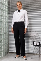 Брюки прямого силуэта на притачном поясе со шлевками и застежкой-гульфик. Пояс застегивается на крючок и потайную петлю-пуговицу. Перед со складкой и заутюженной стрелкой от складки по всей длине брюк и карманами в боковых швах с наклонным входом. Спинка с вытачкой от пояса и заутюженной стрелкой по все длине брюк.